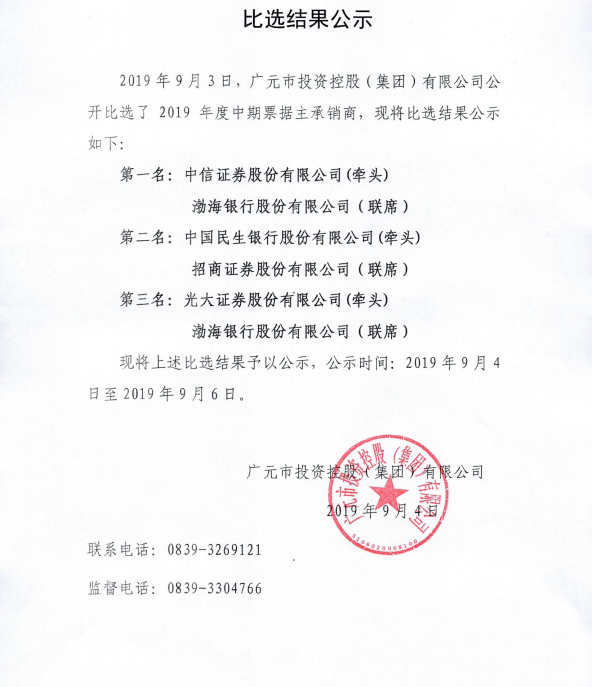 2019年度中期票據(jù)比選結(jié)果公示