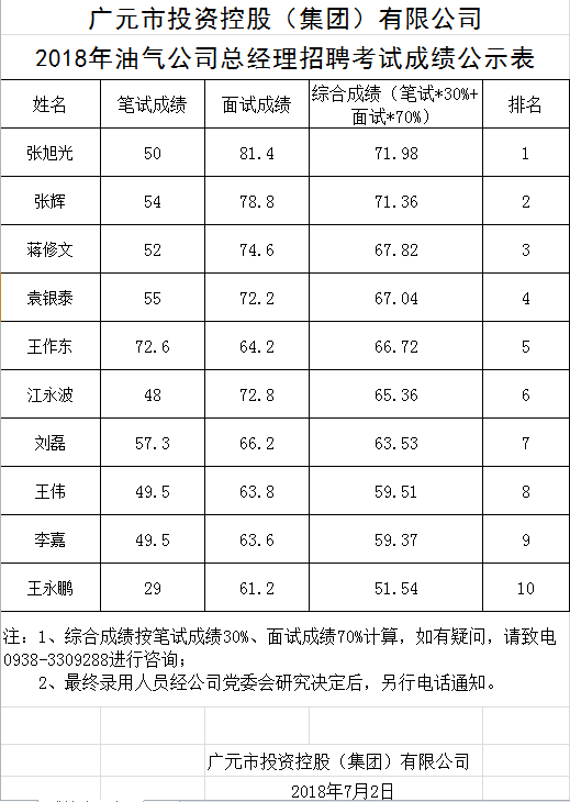 廣元市投資控股(集團(tuán))有限公司2018年油氣公司總經(jīng)理招聘考試成績(jī)公示表