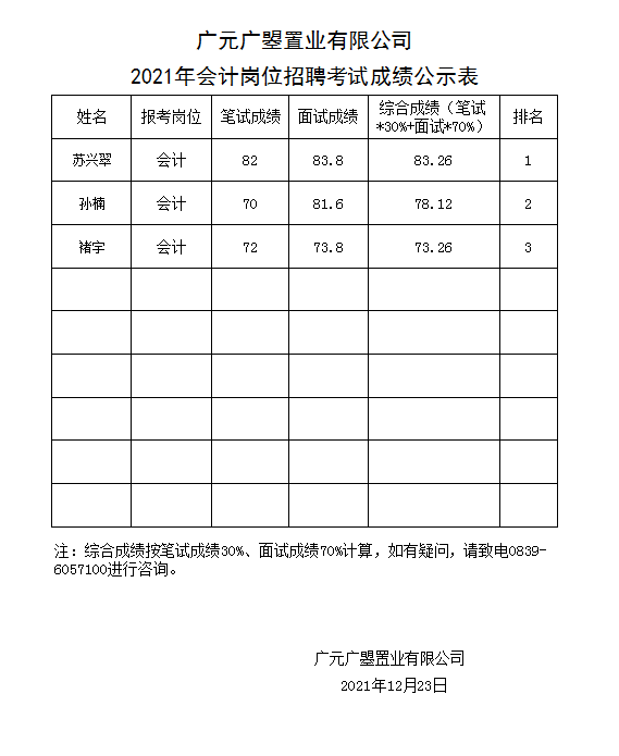 廣元廣曌置業(yè)有限公司2021年會(huì)計(jì)崗位招聘考試成績(jī)公示